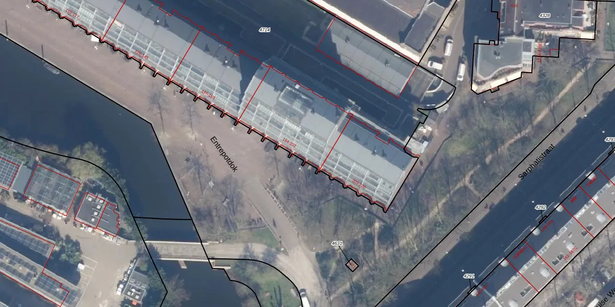 Het perceel waarop Entrepotdok 195 staat heeft een oppervlakte van 5978 m². Dit is een zeer groot perceel. De perceeloppervlakte wordt geregistreerd door het Kadaster. Gedetailleerde informatie over de maten van dit perceel kunt u vinden in het rapport Kadastrale kaart met maatvoering van Entrepotdok 195.