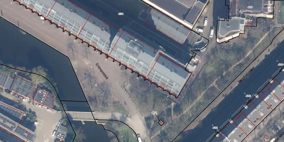 Het perceel waarop Entrepotdok 196 staat heeft een oppervlakte van 5978 m². Dit is een zeer groot perceel. De perceeloppervlakte wordt geregistreerd door het Kadaster. Gedetailleerde informatie over de maten van dit perceel kunt u vinden in het rapport Kadastrale kaart met maatvoering van Entrepotdok 196.