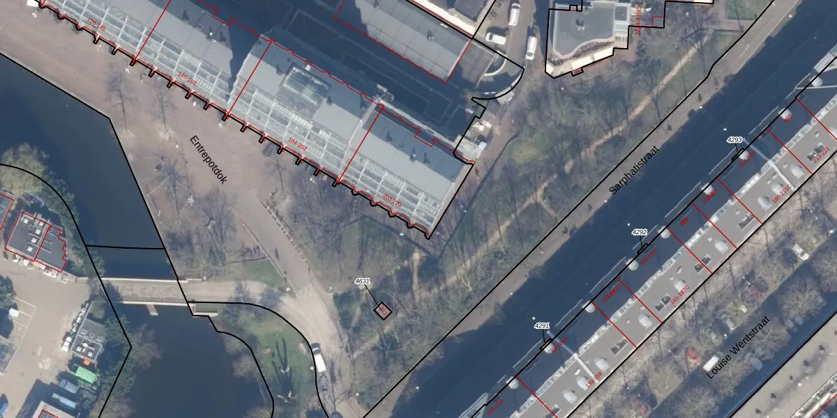 Het perceel waarop Entrepotdok 218 staat heeft een oppervlakte van 5978 m². Dit is een zeer groot perceel. De perceeloppervlakte wordt geregistreerd door het Kadaster. Gedetailleerde informatie over de maten van dit perceel kunt u vinden in het rapport Kadastrale kaart met maatvoering van Entrepotdok 218.