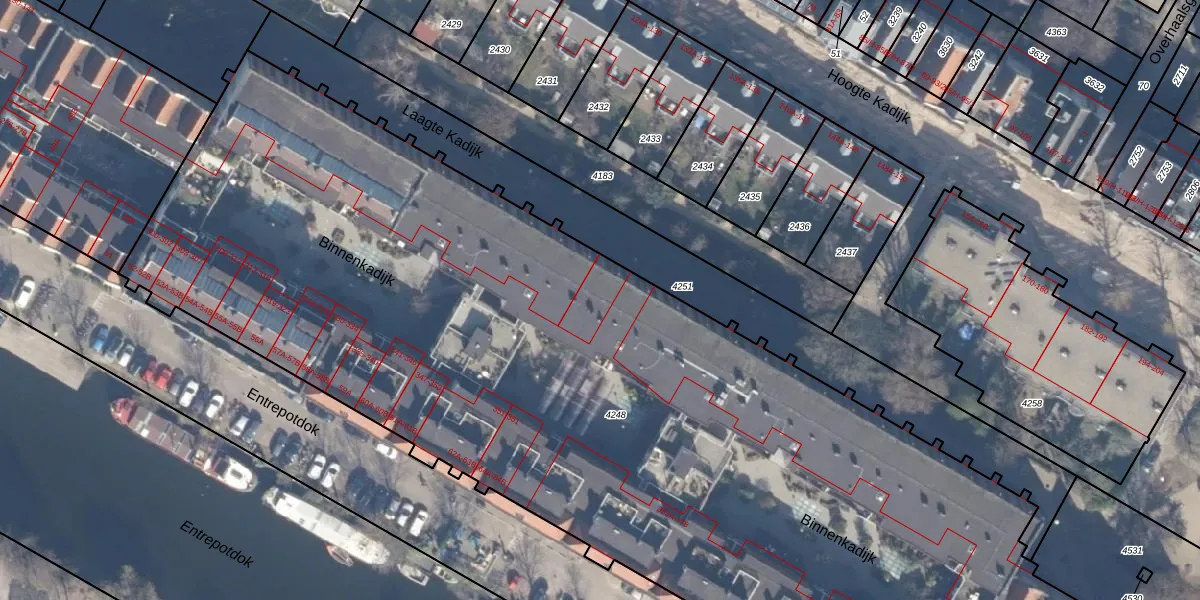 Het perceel waarop Entrepotdok 65-A staat heeft een oppervlakte van 7844 m². Dit is een zeer groot perceel. De perceeloppervlakte wordt geregistreerd door het Kadaster. Gedetailleerde informatie over de maten van dit perceel kunt u vinden in het rapport Kadastrale kaart met maatvoering van Entrepotdok 65-A.