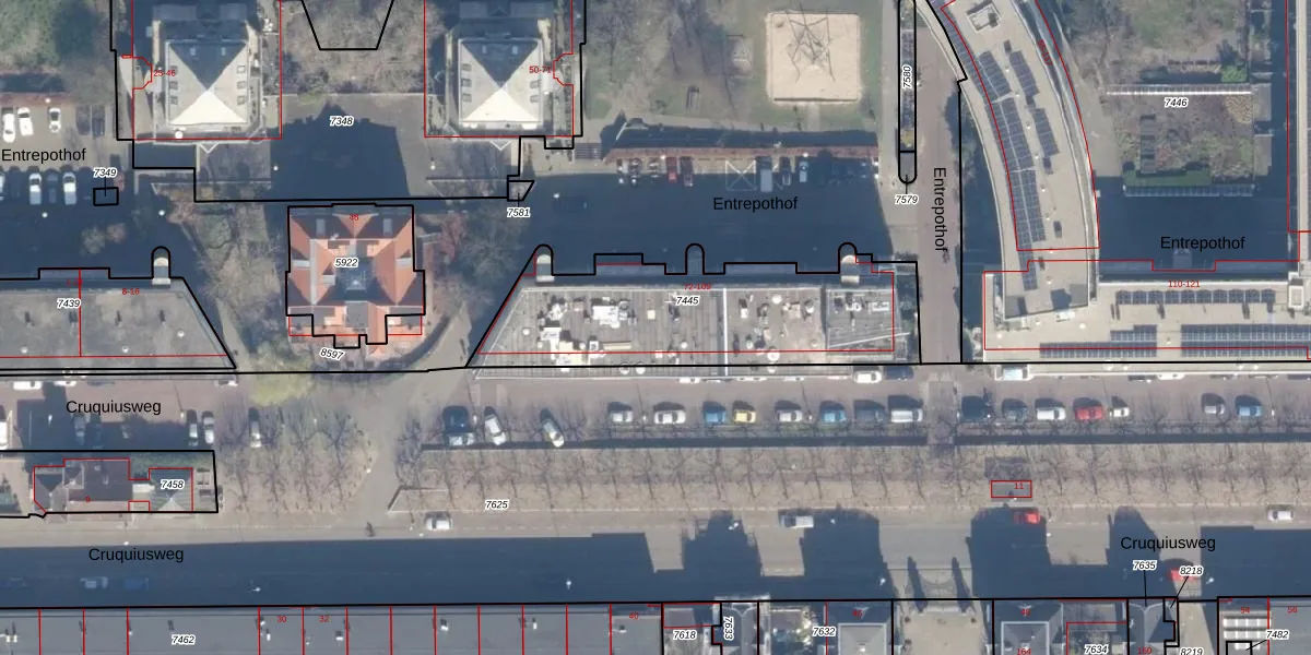 Entrepothof 100 is gelegen op kadastraal perceel ASD02A7445. Deze kadastrale aanduiding is uniek en wordt gebruikt door het Kadaster om eigendomsrechten en andere zakelijke rechten vast te leggen. Het perceel maakt onderdeel uit van de kadastrale gemeente Amsterdam.