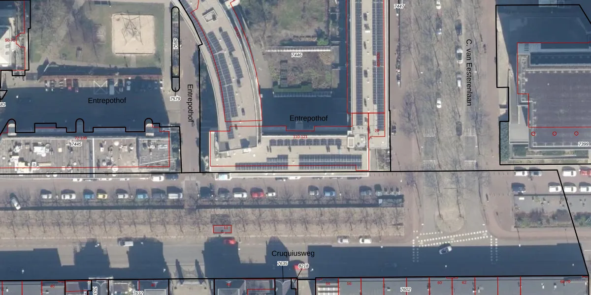 Het perceel waarop Entrepothof 116 staat heeft een oppervlakte van 6055 m². Dit is een zeer groot perceel. De perceeloppervlakte wordt geregistreerd door het Kadaster. Gedetailleerde informatie over de maten van dit perceel kunt u vinden in het rapport Kadastrale kaart met maatvoering van Entrepothof 116.