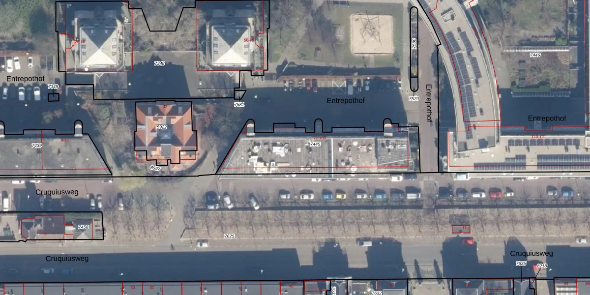Het perceel waarop Entrepothof 76 staat heeft een oppervlakte van 1045 m². Dit is een zeer groot perceel. De perceeloppervlakte wordt geregistreerd door het Kadaster. Gedetailleerde informatie over de maten van dit perceel kunt u vinden in het rapport Kadastrale kaart met maatvoering van Entrepothof 76.