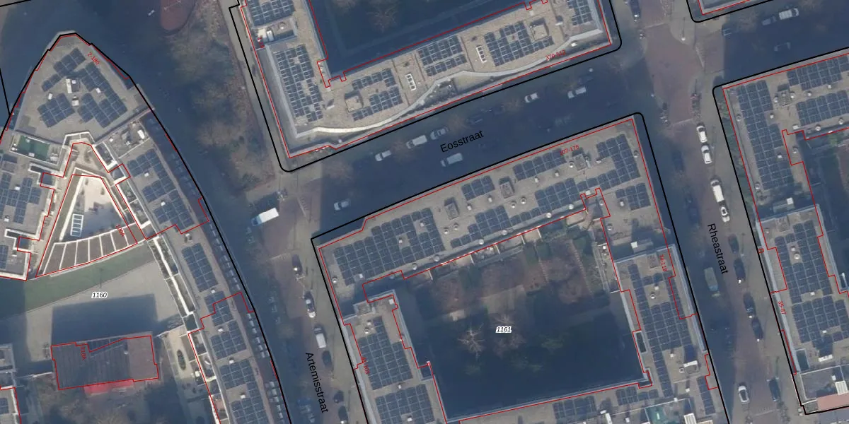 Het perceel waarop Eosstraat 157 staat heeft een oppervlakte van 5945 m². Dit is een zeer groot perceel. De perceeloppervlakte wordt geregistreerd door het Kadaster. Gedetailleerde informatie over de maten van dit perceel kunt u vinden in het rapport Kadastrale kaart met maatvoering van Eosstraat 157.