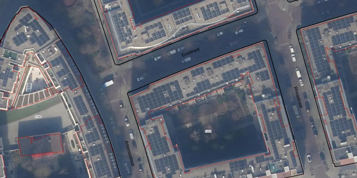 Het perceel waarop Eosstraat 167 staat heeft een oppervlakte van 5945 m². Dit is een zeer groot perceel. De perceeloppervlakte wordt geregistreerd door het Kadaster. Gedetailleerde informatie over de maten van dit perceel kunt u vinden in het rapport Kadastrale kaart met maatvoering van Eosstraat 167.