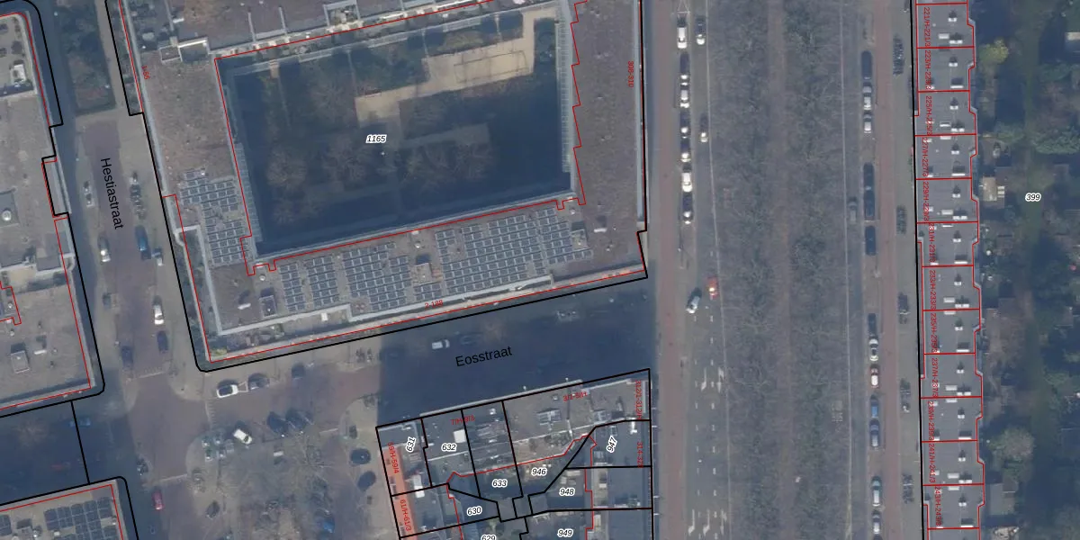 Het perceel waarop Eosstraat 30 staat heeft een oppervlakte van 6883 m². Dit is een zeer groot perceel. De perceeloppervlakte wordt geregistreerd door het Kadaster. Gedetailleerde informatie over de maten van dit perceel kunt u vinden in het rapport Kadastrale kaart met maatvoering van Eosstraat 30.