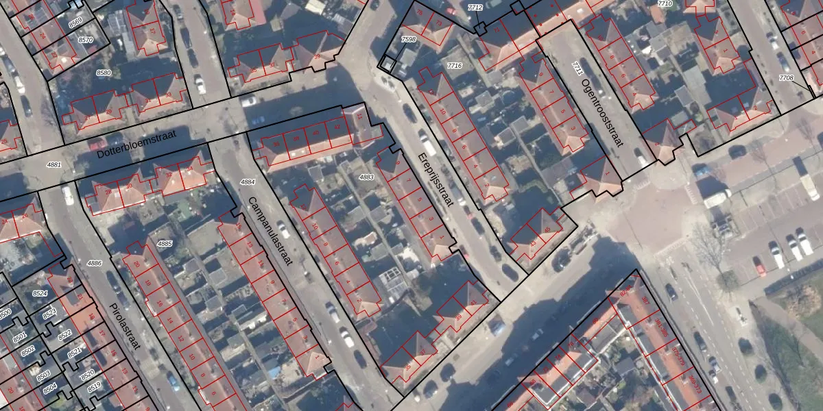 Het perceel waarop Ereprijsstraat 5 staat heeft een oppervlakte van 2116 m². Dit is een zeer groot perceel. De perceeloppervlakte wordt geregistreerd door het Kadaster. Gedetailleerde informatie over de maten van dit perceel kunt u vinden in het rapport Kadastrale kaart met maatvoering van Ereprijsstraat 5.