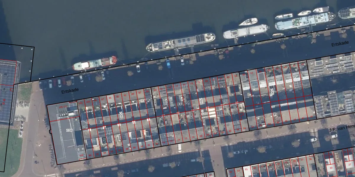 Het perceel waarop Ertskade 77 staat heeft een oppervlakte van 1723 m². Dit is een zeer groot perceel. De perceeloppervlakte wordt geregistreerd door het Kadaster. Gedetailleerde informatie over de maten van dit perceel kunt u vinden in het rapport Kadastrale kaart met maatvoering van Ertskade 77.