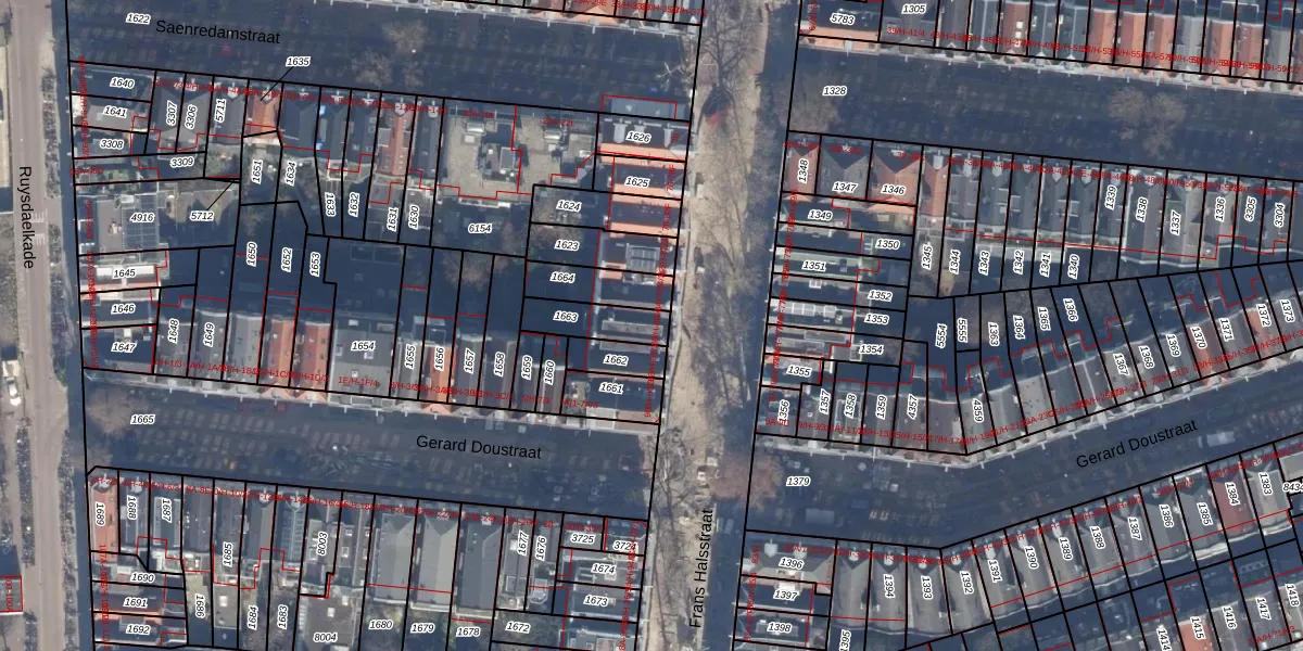 Het perceel waarop het adres ligt is ASD14-R-1663. De afkorting 'ASD14' staat voor kadastrale gemeente Amsterdam. Het perceel is 123 m² groot. Dat is kleiner dan de gemiddelde perceeloppervlakte in Amsterdam, dat op 354,38 m² ligt. Het kleinste perceel in de kadastrale gemeente is 0 m² groot. De grootste perceeloppervlakte is 9,9 ha. Er zijn 5 adressen aanwezig op het perceel. De laatste wijziging in het de Basisregistratie Kadaster (BRK) was op 06-10-2006.