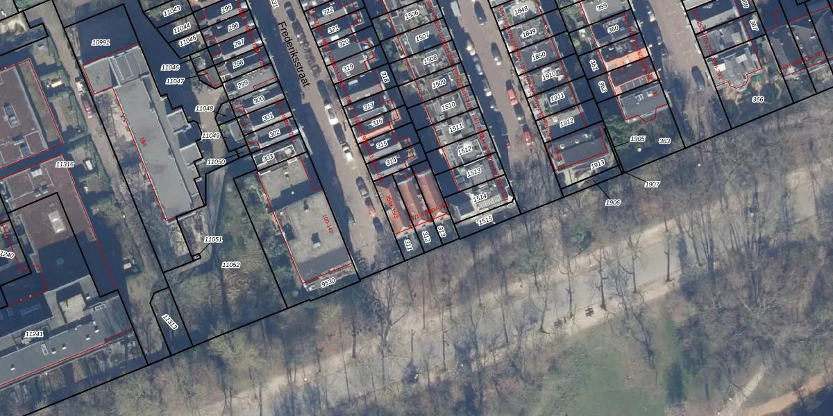 Het perceel waarop Frederiksstraat 37-1 staat heeft een oppervlakte van 96 m². Dit is een klein perceel. De perceeloppervlakte wordt geregistreerd door het Kadaster. Gedetailleerde informatie over de maten van dit perceel kunt u vinden in het rapport Kadastrale kaart met maatvoering van Frederiksstraat 37-1.