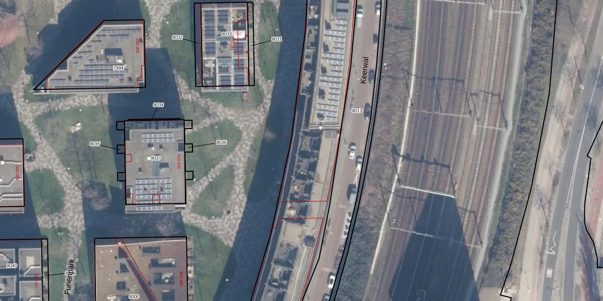 Het perceel waarop Funenpark 104 staat heeft een oppervlakte van 8973 m². Dit is een zeer groot perceel. De perceeloppervlakte wordt geregistreerd door het Kadaster. Gedetailleerde informatie over de maten van dit perceel kunt u vinden in het rapport Kadastrale kaart met maatvoering van Funenpark 104.
