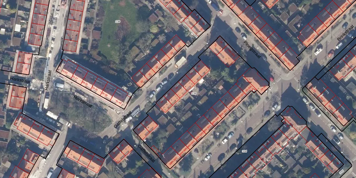 Het perceel waarop Gaffelstraat 25 staat heeft een oppervlakte van 2395 m². Dit is een zeer groot perceel. De perceeloppervlakte wordt geregistreerd door het Kadaster. Gedetailleerde informatie over de maten van dit perceel kunt u vinden in het rapport Kadastrale kaart met maatvoering van Gaffelstraat 25.