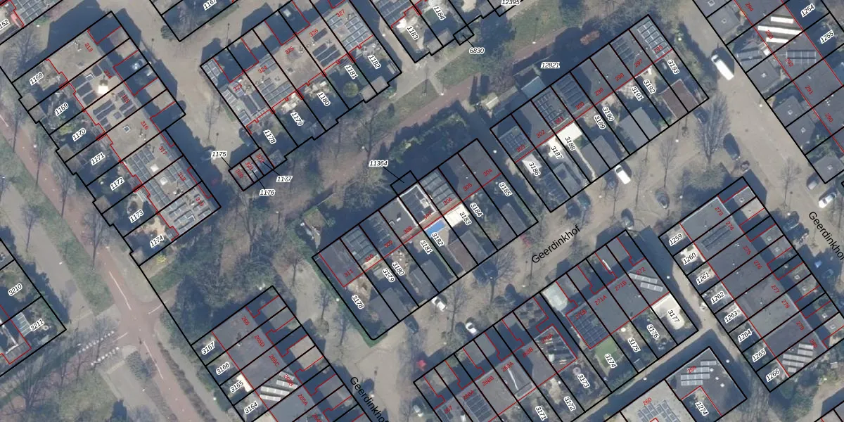 Geerdinkhof 307 is gelegen op kadastraal perceel WPK02L3182. Deze kadastrale aanduiding is uniek en wordt gebruikt door het Kadaster om eigendomsrechten en andere zakelijke rechten vast te leggen. Het perceel maakt onderdeel uit van de kadastrale gemeente Weesperkarspel.