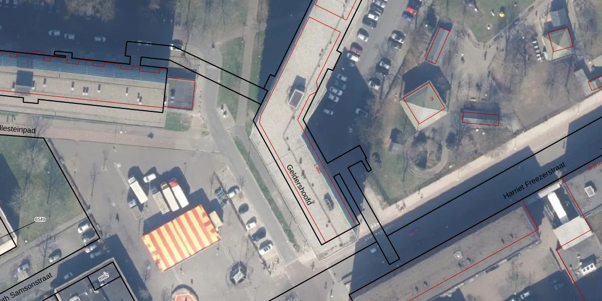 Het perceel waarop Geldershoofd 105 staat heeft een oppervlakte van 5300 m². Dit is een zeer groot perceel. De perceeloppervlakte wordt geregistreerd door het Kadaster. Gedetailleerde informatie over de maten van dit perceel kunt u vinden in het rapport Kadastrale kaart met maatvoering van Geldershoofd 105.