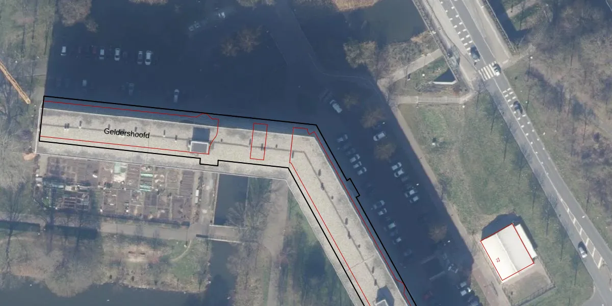 Het perceel waarop Geldershoofd 438 staat heeft een oppervlakte van 5300 m². Dit is een zeer groot perceel. De perceeloppervlakte wordt geregistreerd door het Kadaster. Gedetailleerde informatie over de maten van dit perceel kunt u vinden in het rapport Kadastrale kaart met maatvoering van Geldershoofd 438.