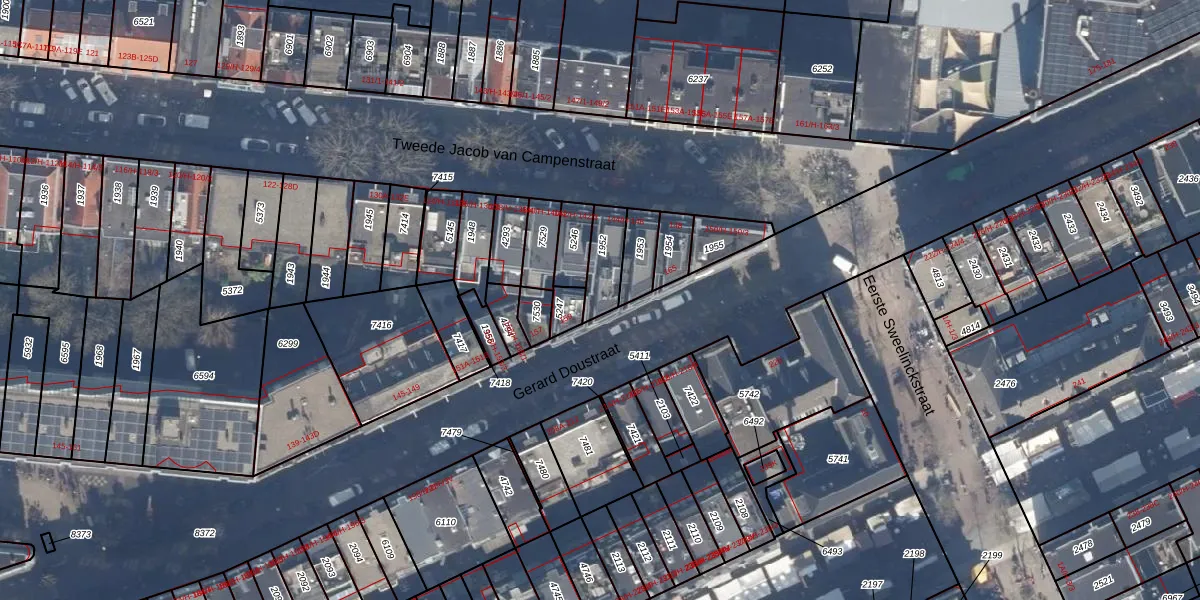 Het perceel waarop Gerard Doustraat 163-A staat heeft een oppervlakte van 105 m². Dit is een middelgroot perceel. De perceeloppervlakte wordt geregistreerd door het Kadaster. Gedetailleerde informatie over de maten van dit perceel kunt u vinden in het rapport Kadastrale kaart met maatvoering van Gerard Doustraat 163-A.