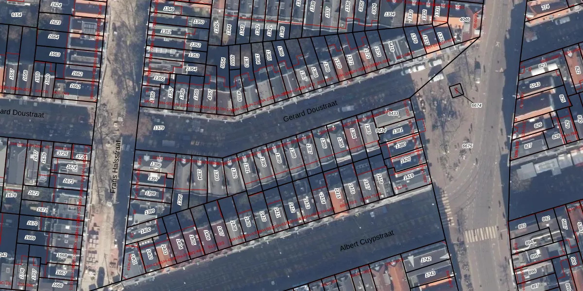Het perceel waarop het adres ligt is ASD14-R-1388. De afkorting 'ASD14' staat voor kadastrale gemeente Amsterdam. De gemiddelde perceelgrootte in Amsterdam is 354,38 m². Dit perceel is kleiner: de perceeloppervlakte bedraagt 81 m². De grootste perceeloppervlakte in de kadastrale gemeente is 9,9 ha. De kleinste oppervlakte bedraagt 0 m². Op het perceel zijn 4 adressen aanwezig. De huidige grenzen van het perceel zijn digitaal in de Basisregistratie Kadaster (BRK) geregistreerd op 06-10-2006.