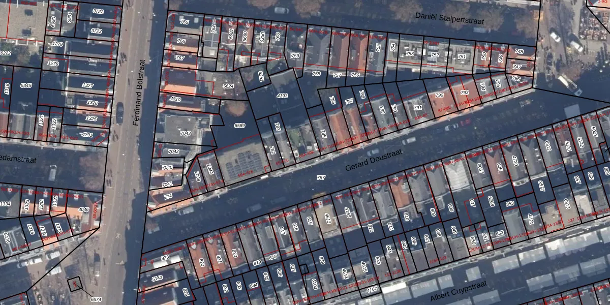 Het perceel waarop Gerard Doustraat 69-A staat heeft een oppervlakte van 337 m². Dit is een groot perceel. De perceeloppervlakte wordt geregistreerd door het Kadaster. Gedetailleerde informatie over de maten van dit perceel kunt u vinden in het rapport Kadastrale kaart met maatvoering van Gerard Doustraat 69-A.