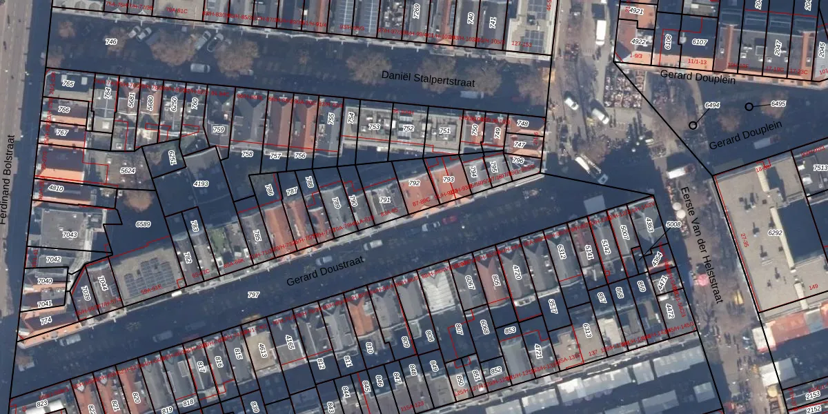 Gerard Doustraat 87 is gelegen op kadastraal perceel ASD14R792. Deze kadastrale aanduiding is uniek en wordt gebruikt door het Kadaster om eigendomsrechten en andere zakelijke rechten vast te leggen. Het perceel maakt onderdeel uit van de kadastrale gemeente Amsterdam.