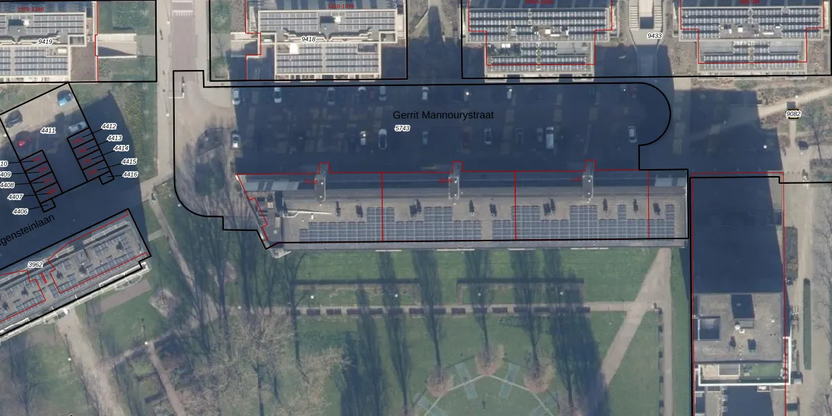 Het perceel waarop Gerrit Mannourystraat 65 staat heeft een oppervlakte van 4422 m². Dit is een zeer groot perceel. De perceeloppervlakte wordt geregistreerd door het Kadaster. Gedetailleerde informatie over de maten van dit perceel kunt u vinden in het rapport Kadastrale kaart met maatvoering van Gerrit Mannourystraat 65.