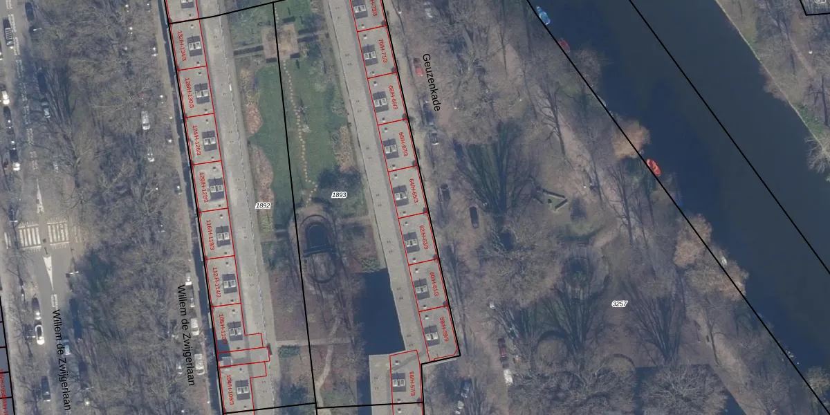 Het perceel waarop Geuzenkade 64-2 staat heeft een oppervlakte van 3053 m². Dit is een zeer groot perceel. De perceeloppervlakte wordt geregistreerd door het Kadaster. Gedetailleerde informatie over de maten van dit perceel kunt u vinden in het rapport Kadastrale kaart met maatvoering van Geuzenkade 64-2.