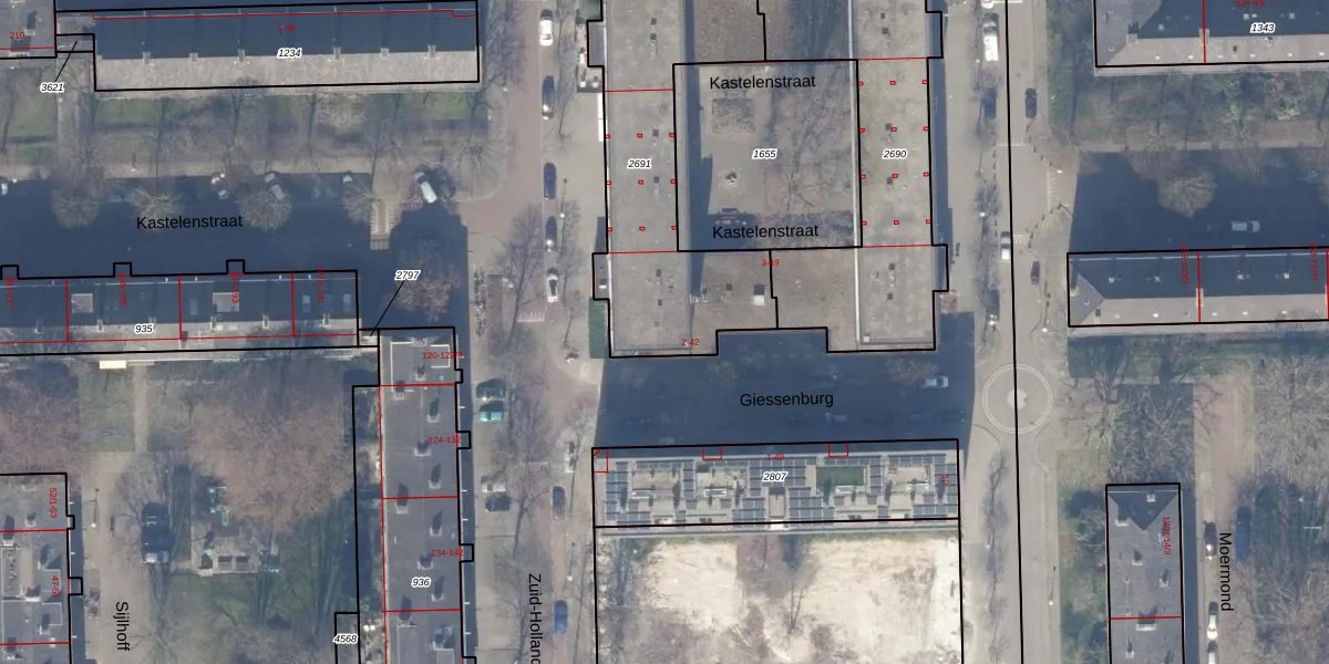 Het perceel waarop Giessenburg 32 staat heeft een oppervlakte van 1037 m². Dit is een zeer groot perceel. De perceeloppervlakte wordt geregistreerd door het Kadaster. Gedetailleerde informatie over de maten van dit perceel kunt u vinden in het rapport Kadastrale kaart met maatvoering van Giessenburg 32.