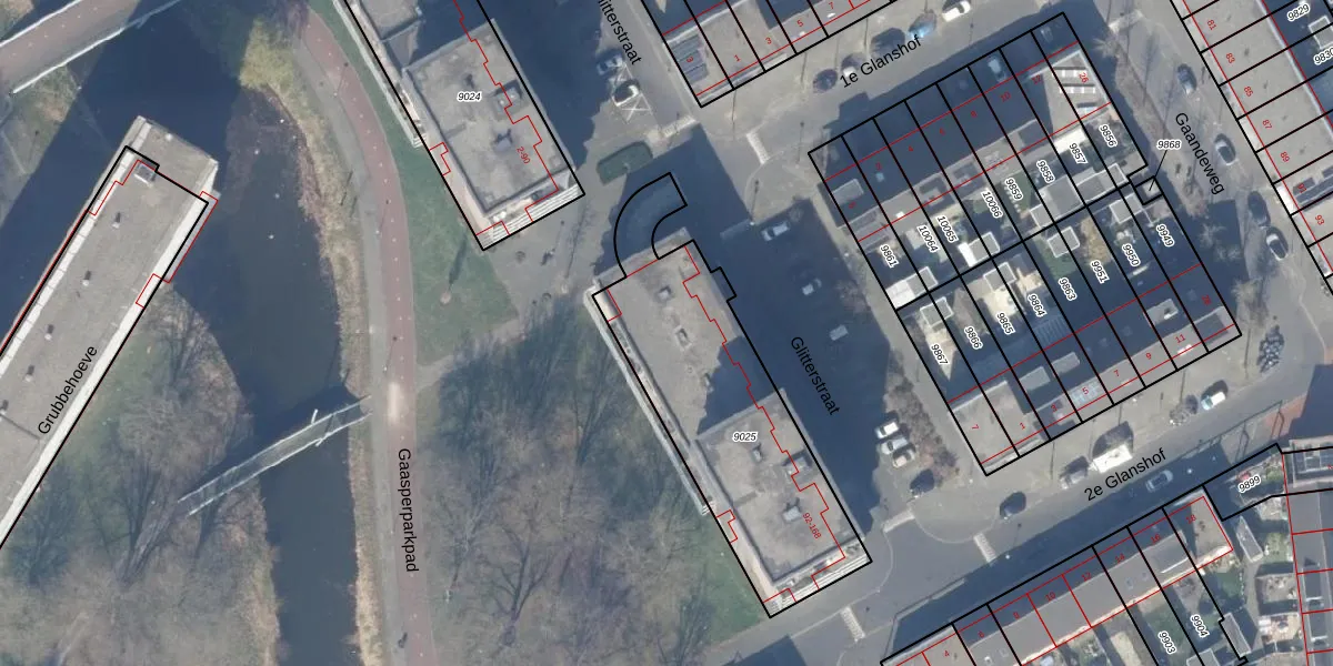 Het perceel waarop Glitterstraat 102 staat heeft een oppervlakte van 1050 m². Dit is een zeer groot perceel. De perceeloppervlakte wordt geregistreerd door het Kadaster. Gedetailleerde informatie over de maten van dit perceel kunt u vinden in het rapport Kadastrale kaart met maatvoering van Glitterstraat 102.