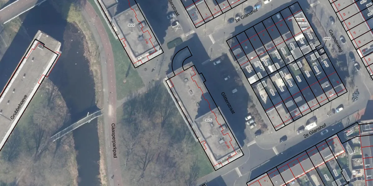 Glitterstraat 104 is gelegen op kadastraal perceel WPK02L9025. Deze kadastrale aanduiding is uniek en wordt gebruikt door het Kadaster om eigendomsrechten en andere zakelijke rechten vast te leggen. Het perceel maakt onderdeel uit van de kadastrale gemeente Weesperkarspel.