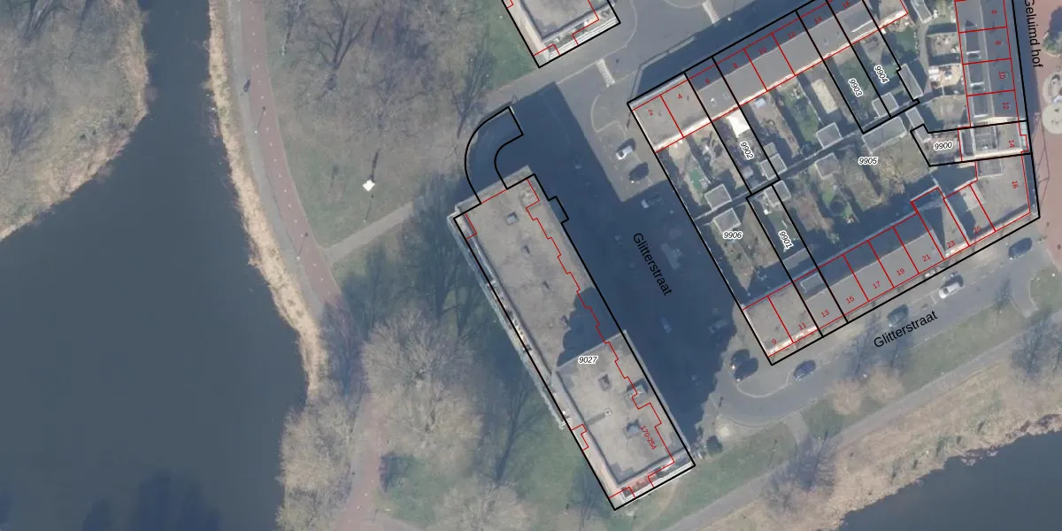 Glitterstraat 188 is gelegen op kadastraal perceel WPK02L9027. Deze kadastrale aanduiding is uniek en wordt gebruikt door het Kadaster om eigendomsrechten en andere zakelijke rechten vast te leggen. Het perceel maakt onderdeel uit van de kadastrale gemeente Weesperkarspel.