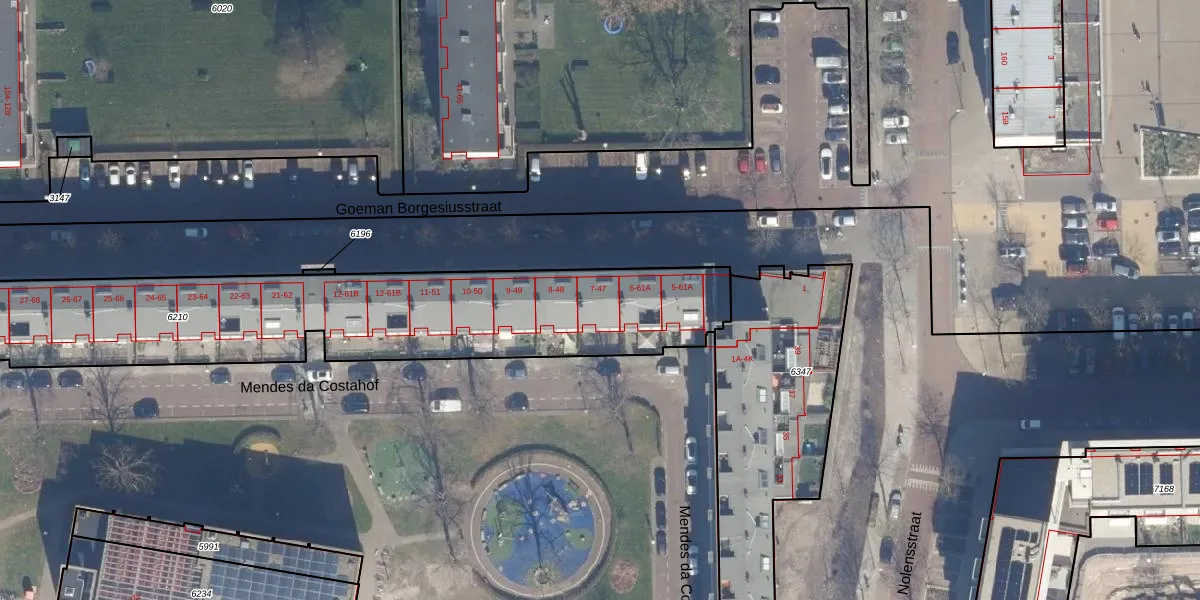 Het perceel waarop Goeman Borgesiusstraat 15 staat heeft een oppervlakte van 2307 m². Dit is een zeer groot perceel. De perceeloppervlakte wordt geregistreerd door het Kadaster. Gedetailleerde informatie over de maten van dit perceel kunt u vinden in het rapport Kadastrale kaart met maatvoering van Goeman Borgesiusstraat 15.
