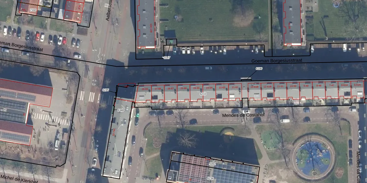 Het perceel waarop Goeman Borgesiusstraat 25 staat heeft een oppervlakte van 2307 m². Dit is een zeer groot perceel. De perceeloppervlakte wordt geregistreerd door het Kadaster. Gedetailleerde informatie over de maten van dit perceel kunt u vinden in het rapport Kadastrale kaart met maatvoering van Goeman Borgesiusstraat 25.