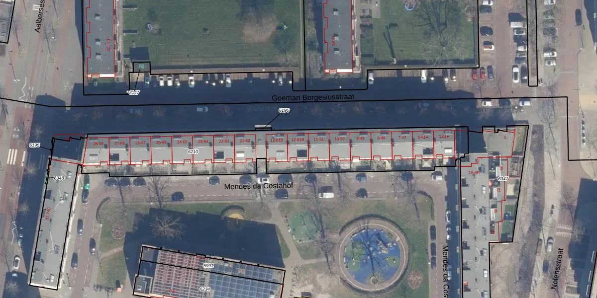 Het perceel waarop Goeman Borgesiusstraat 36 staat heeft een oppervlakte van 2307 m². Dit is een zeer groot perceel. De perceeloppervlakte wordt geregistreerd door het Kadaster. Gedetailleerde informatie over de maten van dit perceel kunt u vinden in het rapport Kadastrale kaart met maatvoering van Goeman Borgesiusstraat 36.