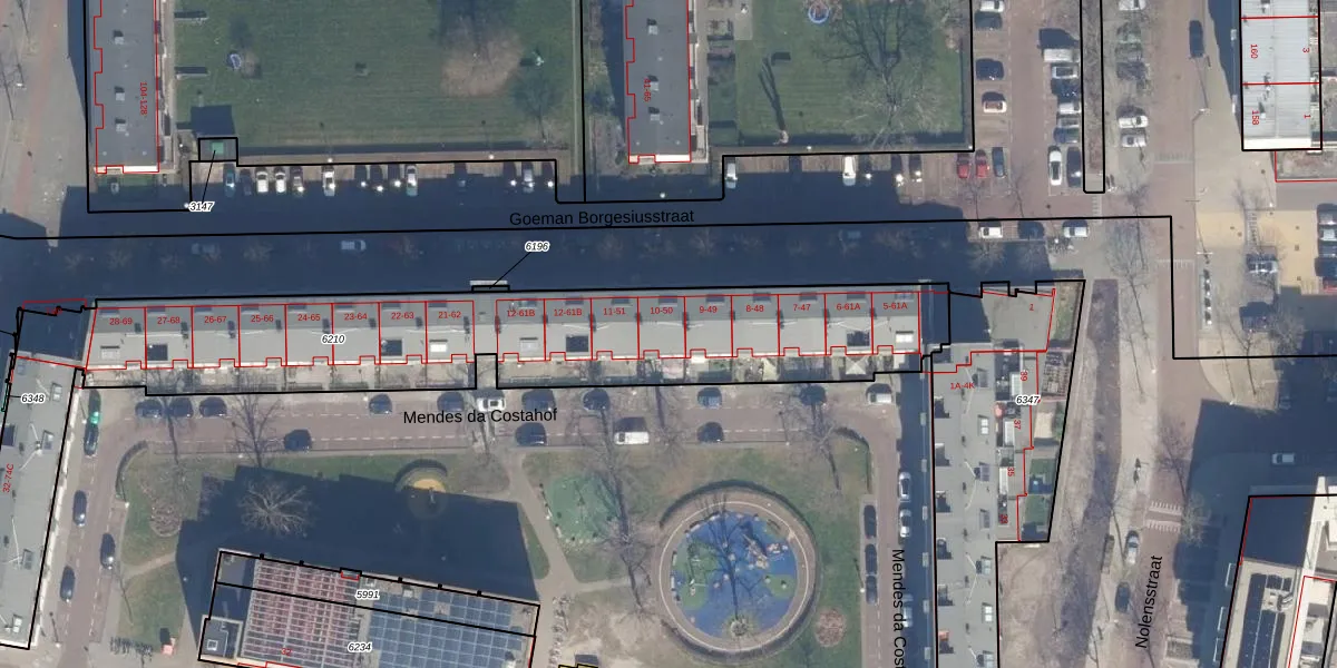 Het perceel waarop Goeman Borgesiusstraat 50 staat heeft een oppervlakte van 2307 m². Dit is een zeer groot perceel. De perceeloppervlakte wordt geregistreerd door het Kadaster. Gedetailleerde informatie over de maten van dit perceel kunt u vinden in het rapport Kadastrale kaart met maatvoering van Goeman Borgesiusstraat 50.