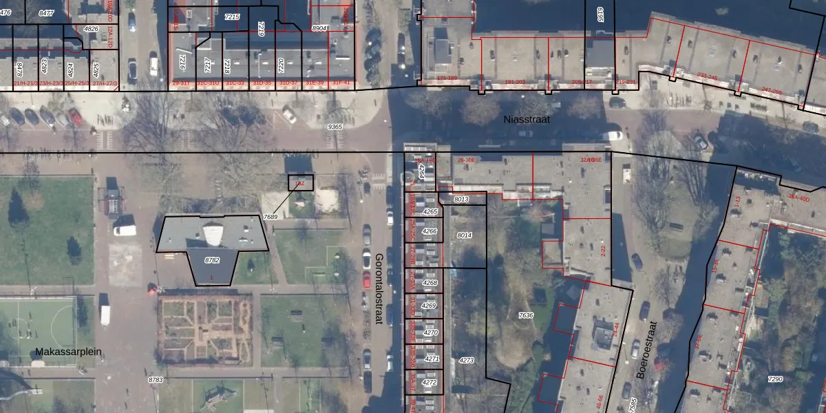 Gorontalostraat 23 is gelegen op kadastraal perceel ASD19W4265. Deze kadastrale aanduiding is uniek en wordt gebruikt door het Kadaster om eigendomsrechten en andere zakelijke rechten vast te leggen. Het perceel maakt onderdeel uit van de kadastrale gemeente Amsterdam.