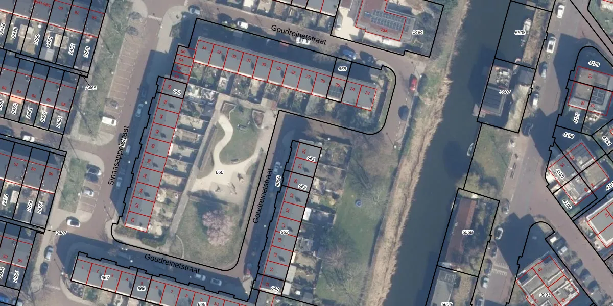 Het perceel waarop Goudreinetstraat 22 staat heeft een oppervlakte van 95 m². Dit is een klein perceel. De perceeloppervlakte wordt geregistreerd door het Kadaster. Gedetailleerde informatie over de maten van dit perceel kunt u vinden in het rapport Kadastrale kaart met maatvoering van Goudreinetstraat 22.