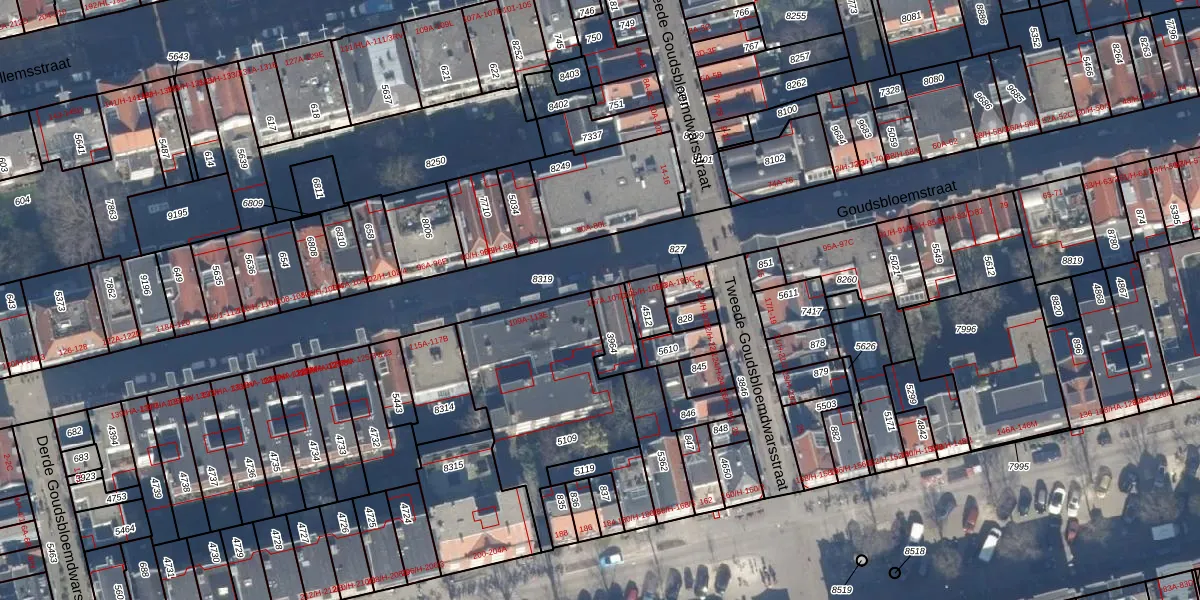 Het perceel waarop Goudsbloemstraat 107-A staat heeft een oppervlakte van 89 m². Dit is een klein perceel. De perceeloppervlakte wordt geregistreerd door het Kadaster. Gedetailleerde informatie over de maten van dit perceel kunt u vinden in het rapport Kadastrale kaart met maatvoering van Goudsbloemstraat 107-A.