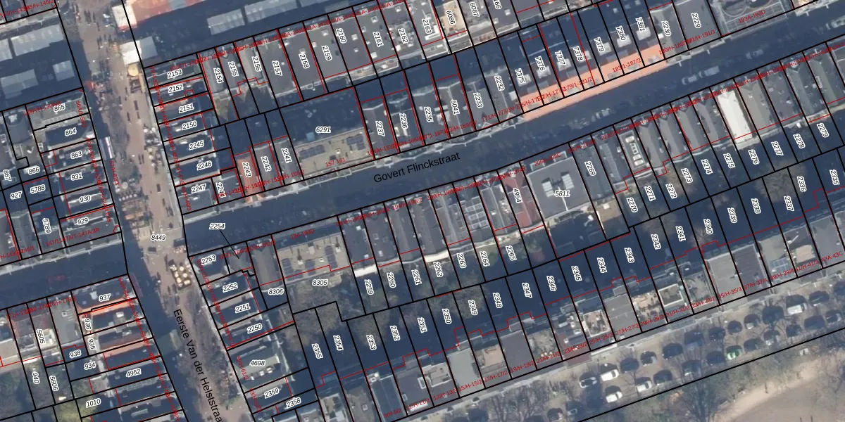 Het adres is gelegen op perceel 2262 in de sectie R en de kadastrale gemeente Amsterdam. De kadastrale aanduiding is aldus ASD14-R-2262. Het perceel is kleiner dan gemiddeld in Amsterdam. Het perceel is 143 m² groot, terwijl het gemiddelde ligt op 354,38 m². Het grootste perceel in de kadastrale gemeente is 9,9 ha. Het kleinste perceel heeft een oppervlakte van 0 m². Er zijn 3 adressen aanwezig op het perceel. De huidige grenzen van het perceel zijn digitaal in de Basisregistratie Kadaster (BRK) geregistreerd op 30-10-2006.
