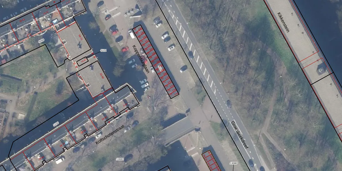 Groesbeekdreef 174 is gelegen op kadastraal perceel WPK02L5103. Deze kadastrale aanduiding is uniek en wordt gebruikt door het Kadaster om eigendomsrechten en andere zakelijke rechten vast te leggen. Het perceel maakt onderdeel uit van de kadastrale gemeente Weesperkarspel.