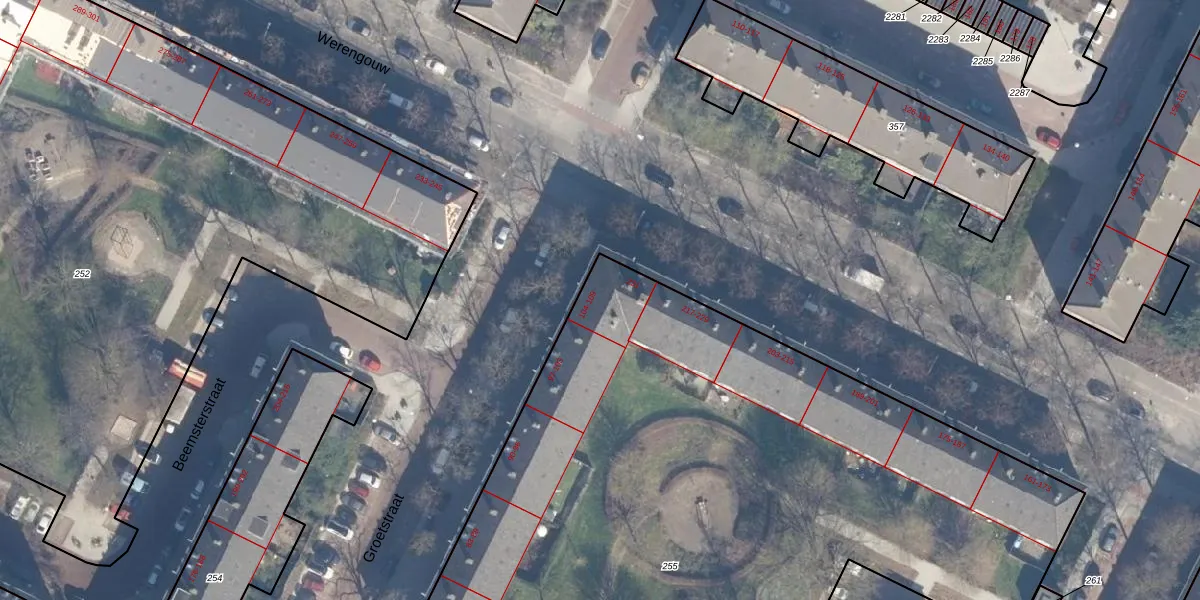 Het perceel waarop Groetstraat 106 staat heeft een oppervlakte van 5495 m². Dit is een zeer groot perceel. De perceeloppervlakte wordt geregistreerd door het Kadaster. Gedetailleerde informatie over de maten van dit perceel kunt u vinden in het rapport Kadastrale kaart met maatvoering van Groetstraat 106.