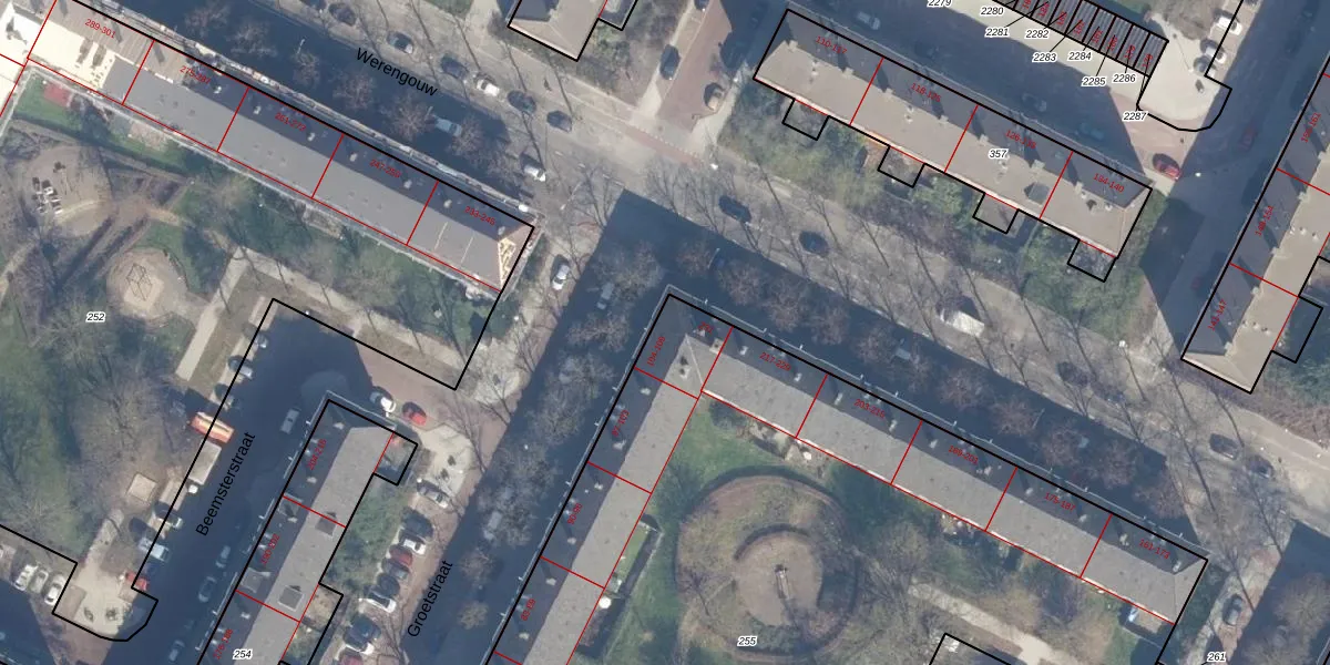 Het perceel waarop Groetstraat 106-A staat heeft een oppervlakte van 5495 m². Dit is een zeer groot perceel. De perceeloppervlakte wordt geregistreerd door het Kadaster. Gedetailleerde informatie over de maten van dit perceel kunt u vinden in het rapport Kadastrale kaart met maatvoering van Groetstraat 106-A.