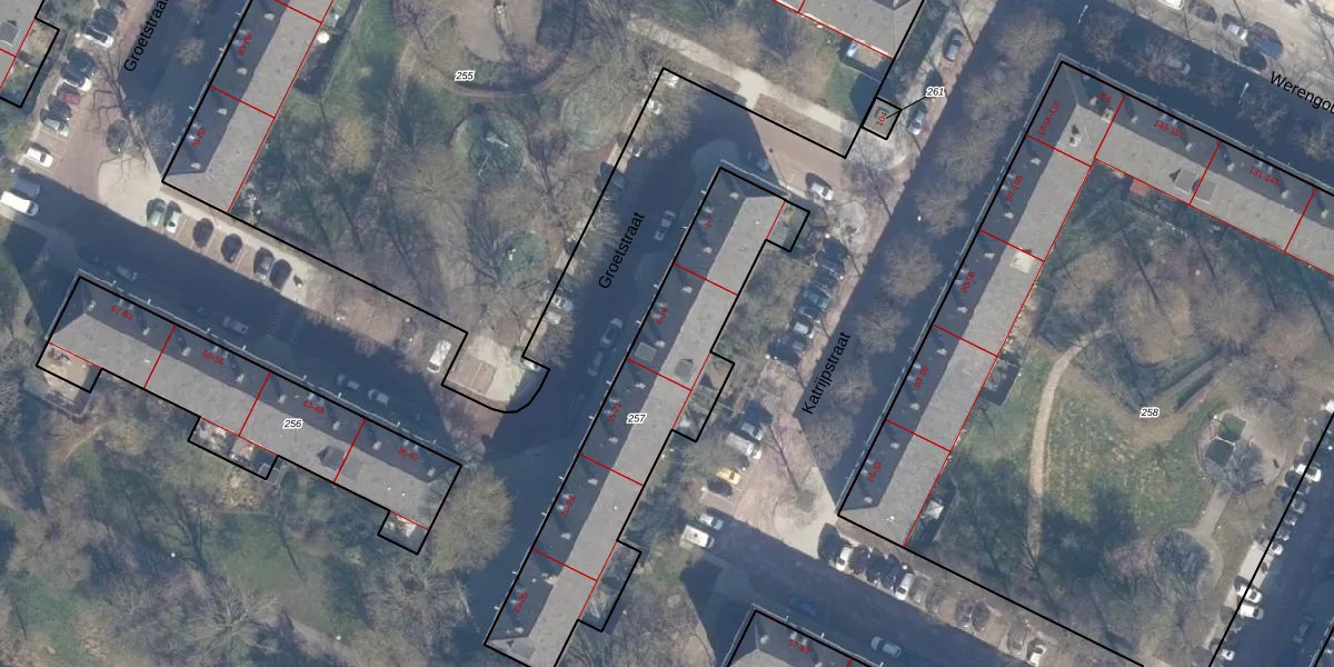 Het perceel waarop Groetstraat 12 staat heeft een oppervlakte van 1001 m². Dit is een zeer groot perceel. De perceeloppervlakte wordt geregistreerd door het Kadaster. Gedetailleerde informatie over de maten van dit perceel kunt u vinden in het rapport Kadastrale kaart met maatvoering van Groetstraat 12.