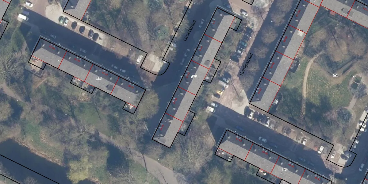 Het perceel waarop Groetstraat 22 staat heeft een oppervlakte van 1001 m². Dit is een zeer groot perceel. De perceeloppervlakte wordt geregistreerd door het Kadaster. Gedetailleerde informatie over de maten van dit perceel kunt u vinden in het rapport Kadastrale kaart met maatvoering van Groetstraat 22.