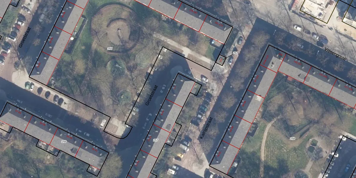 Het perceel waarop Groetstraat 4 staat heeft een oppervlakte van 1001 m². Dit is een zeer groot perceel. De perceeloppervlakte wordt geregistreerd door het Kadaster. Gedetailleerde informatie over de maten van dit perceel kunt u vinden in het rapport Kadastrale kaart met maatvoering van Groetstraat 4.