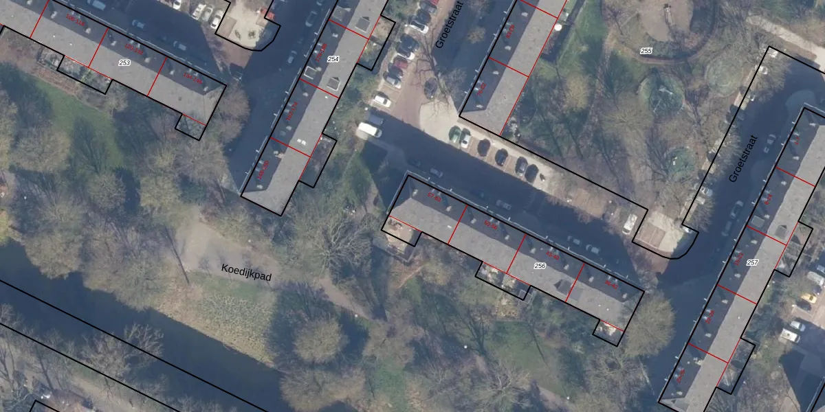Het perceel waarop Groetstraat 62 staat heeft een oppervlakte van 810 m². Dit is een groot perceel. De perceeloppervlakte wordt geregistreerd door het Kadaster. Gedetailleerde informatie over de maten van dit perceel kunt u vinden in het rapport Kadastrale kaart met maatvoering van Groetstraat 62.