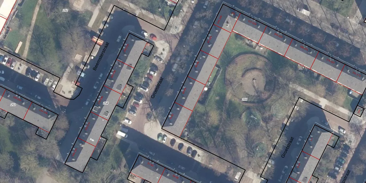 Het perceel waarop Groetstraat 88 staat heeft een oppervlakte van 5495 m². Dit is een zeer groot perceel. De perceeloppervlakte wordt geregistreerd door het Kadaster. Gedetailleerde informatie over de maten van dit perceel kunt u vinden in het rapport Kadastrale kaart met maatvoering van Groetstraat 88.