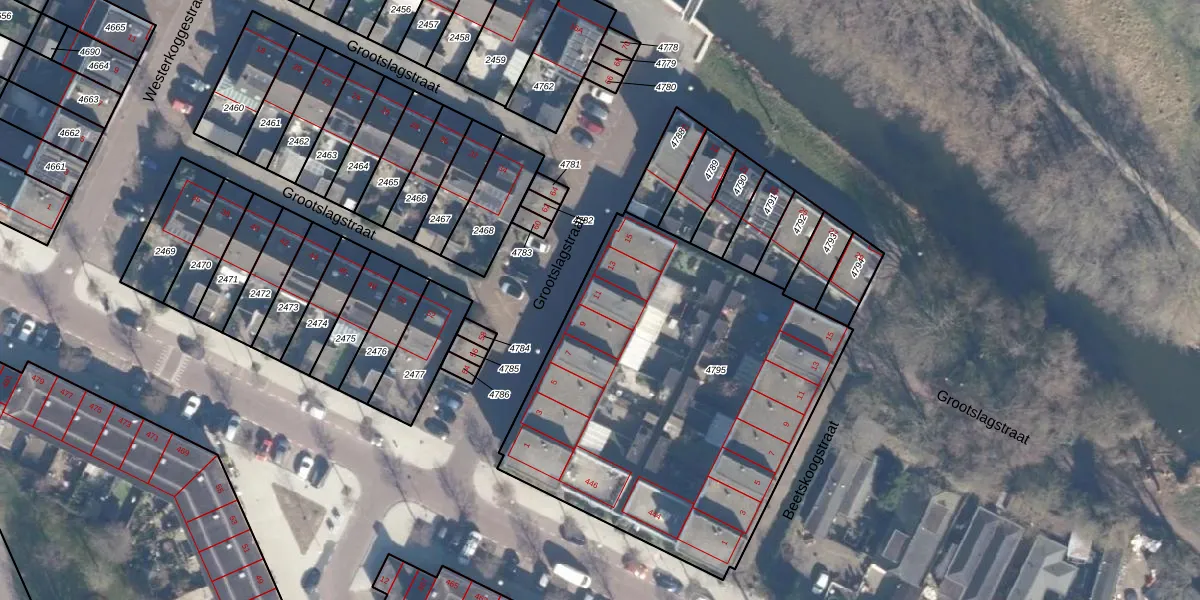 Het perceel waarop Grootslagstraat 11 staat heeft een oppervlakte van 2088 m². Dit is een zeer groot perceel. De perceeloppervlakte wordt geregistreerd door het Kadaster. Gedetailleerde informatie over de maten van dit perceel kunt u vinden in het rapport Kadastrale kaart met maatvoering van Grootslagstraat 11.