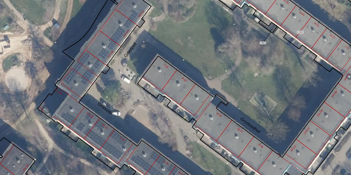 Het perceel waarop Grootzeilhof 18 staat heeft een oppervlakte van 6935 m². Dit is een zeer groot perceel. De perceeloppervlakte wordt geregistreerd door het Kadaster. Gedetailleerde informatie over de maten van dit perceel kunt u vinden in het rapport Kadastrale kaart met maatvoering van Grootzeilhof 18.