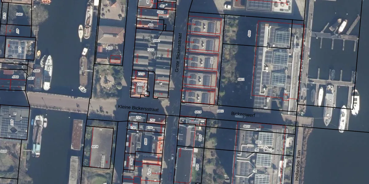 Het perceel waarop Grote Bickersstraat 54-A staat heeft een oppervlakte van 960 m². Dit is een groot perceel. De perceeloppervlakte wordt geregistreerd door het Kadaster. Gedetailleerde informatie over de maten van dit perceel kunt u vinden in het rapport Kadastrale kaart met maatvoering van Grote Bickersstraat 54-A.