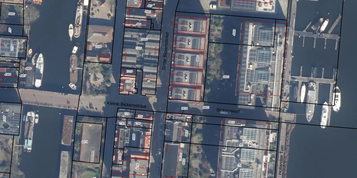 Het perceel waarop Grote Bickersstraat 54-D staat heeft een oppervlakte van 960 m². Dit is een groot perceel. De perceeloppervlakte wordt geregistreerd door het Kadaster. Gedetailleerde informatie over de maten van dit perceel kunt u vinden in het rapport Kadastrale kaart met maatvoering van Grote Bickersstraat 54-D.
