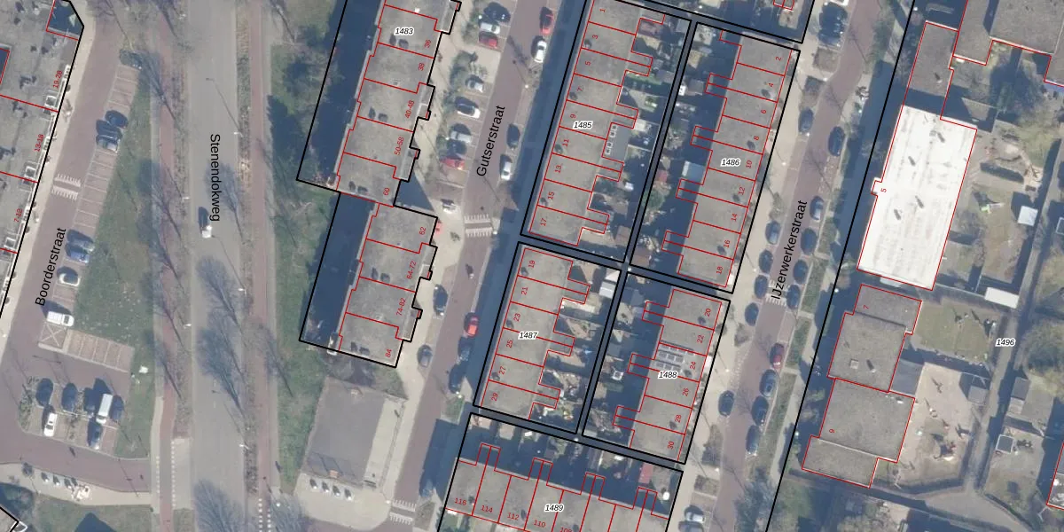 Het perceel waarop Gutserstraat 19 staat heeft een oppervlakte van 640 m². Dit is een groot perceel. De perceeloppervlakte wordt geregistreerd door het Kadaster. Gedetailleerde informatie over de maten van dit perceel kunt u vinden in het rapport Kadastrale kaart met maatvoering van Gutserstraat 19.